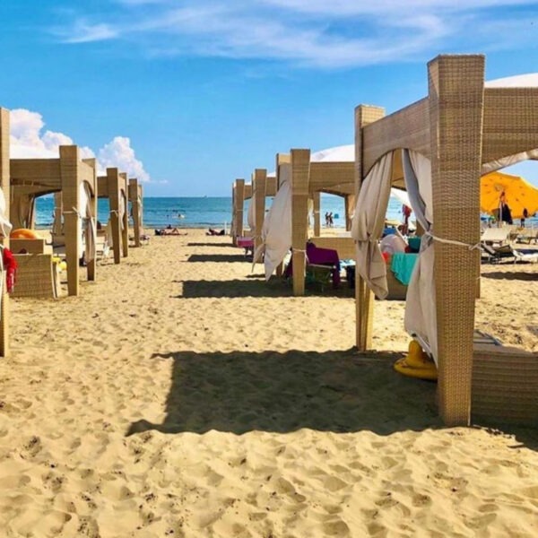 Posto spiaggia riservato con ombrellone, sdraio, lettino e cabina.
